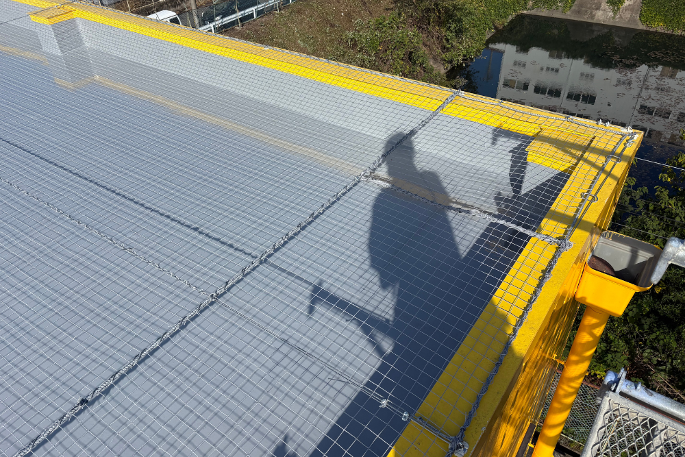 パラペットの笠木部分にアイプレート・ワイヤーロープを設置し、ネットを水平に展開。