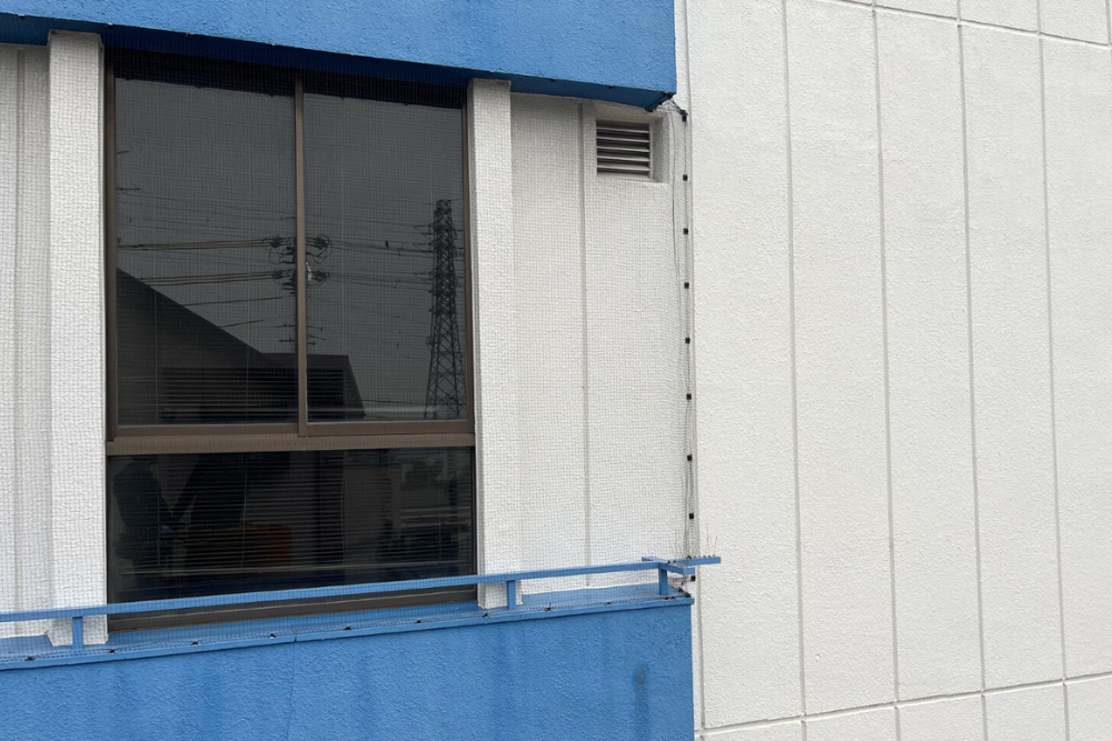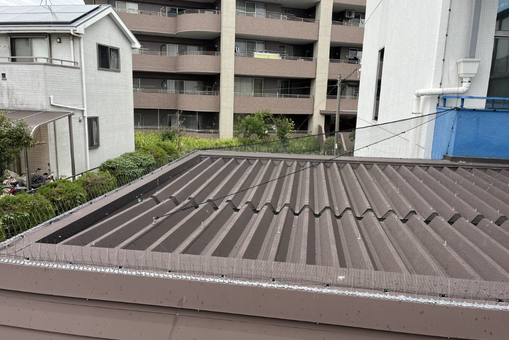 また、ハトが休憩場所や待機場所として利用しやすい屋根端部には防鳥剣山(スパイク)を設置し、着地そのものを不可能にしました。