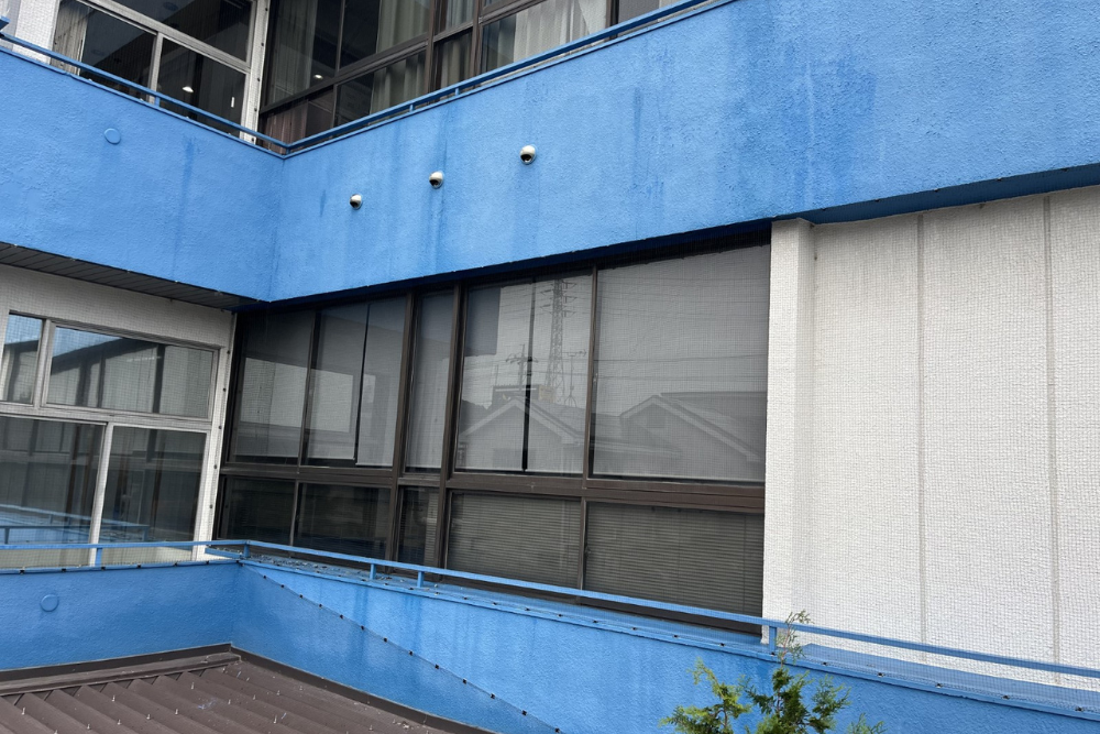 2F・3Fの外部通路は、腰壁ごと開口部をまるっと塞ぐようにネットを取付けました。