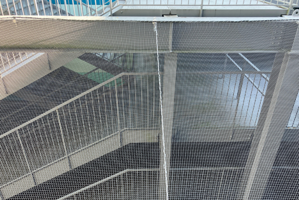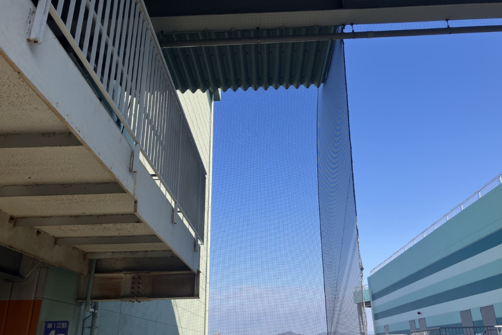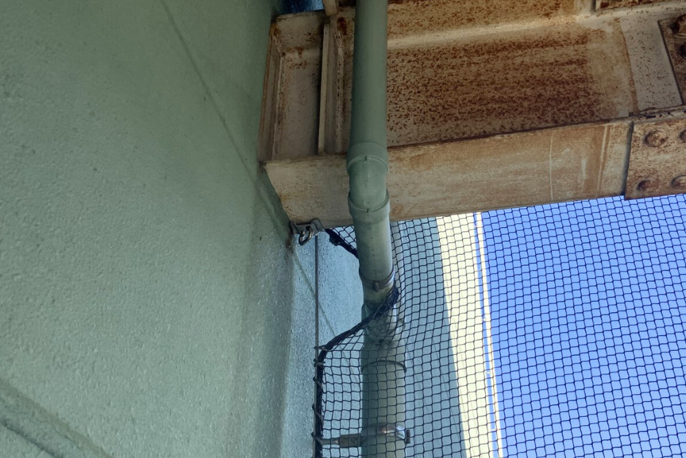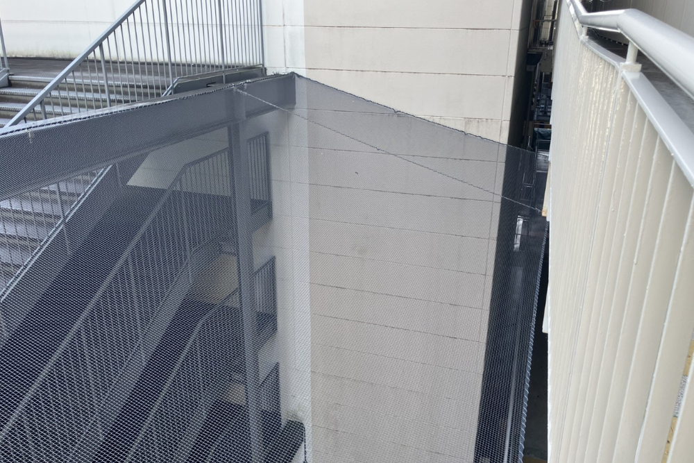 今回の施工では、建物の構造に合わせてネットを張り、目立ちにくいグレー系の色を選定することで、施設の美観を損なわない配慮をしました。