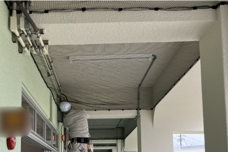 廊下の上部には配管や構造物の凹凸が多く、鳥が巣を作りやすい環境でしたが、ネットを張ることで物理的にシャットアウトしています。