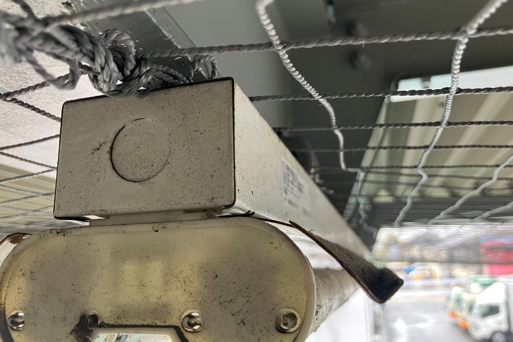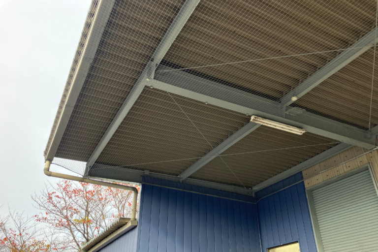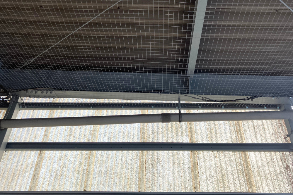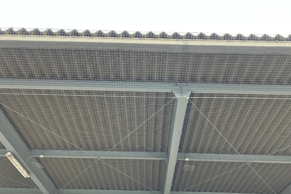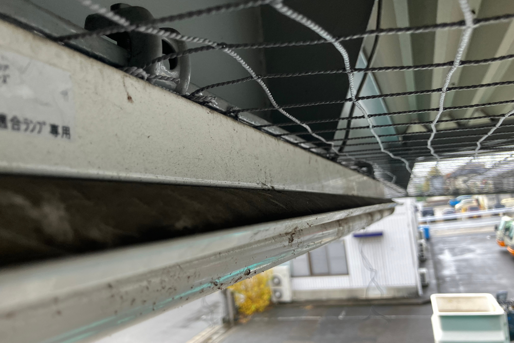 ネットを水平に張ることで、鳥の足場となる梁を物理的に塞ぎ、建物の美観を維持しながら清潔な作業環境を確保することができました。