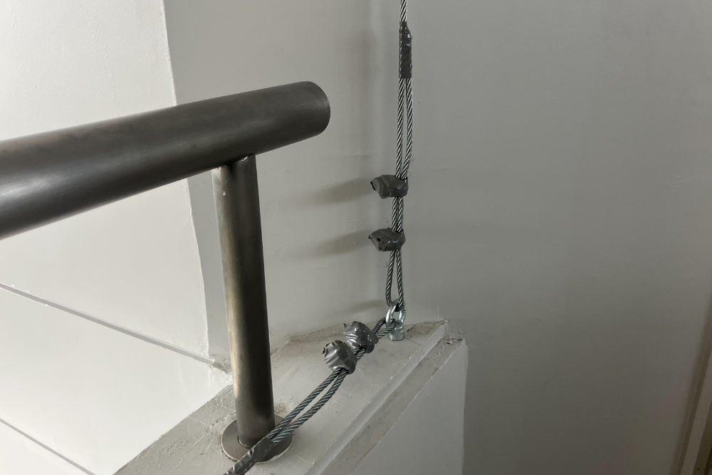 今回の施工では、建物の壁面や床面にアンカーを打ち込み、ワイヤーを枠のように設置する「アンカー&ワイヤー工法」を採用しました。