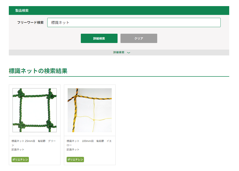 標識ネットには「25mm目有結節 グリーン」と「100mm目 有結節 イエロー」のものがあります。
