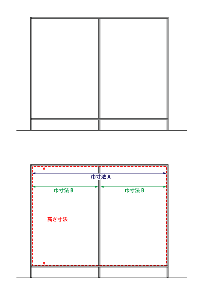 その場合は巾寸法Bのように柱を除いた寸法の採寸をお願いいたします。