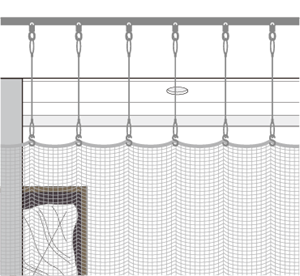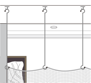 天井及び垂れ壁に吊下げ用のフックを付けるだけで簡単に防犯ネットを設置できます。
