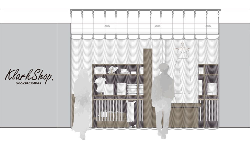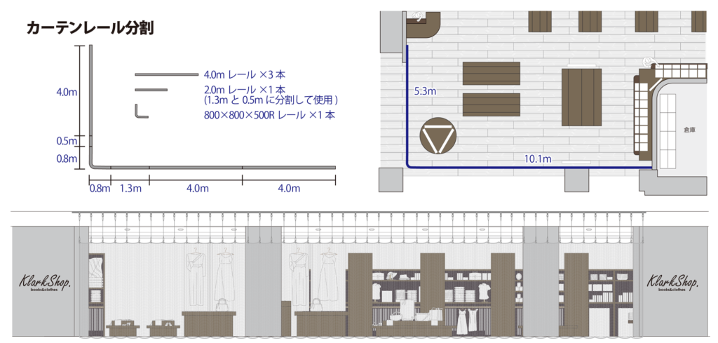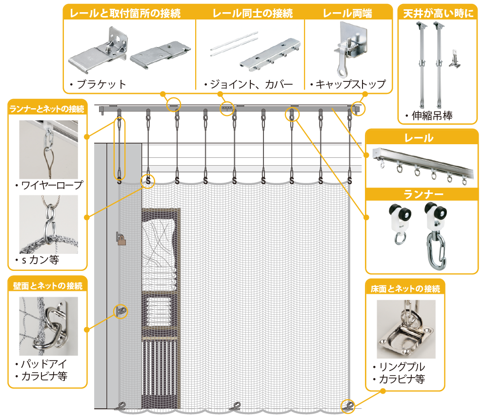 | 適した取付箇所 | ・間口の大きさが広めな箇所 (天井までの高さが3m半以上、幅が10m以上程度) ・開店時にはレールの端部にネット、ランナーをまとめておける、もしくは収納できるBOXの設置できる箇所 |