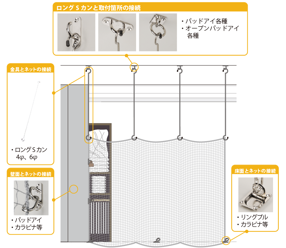| 金具の選定 | 天井部分:パッドアイorオープンパッドアイ+ロングSカン 壁面:パッドアイ+カラビナor南京錠 床面:リングプルor薄型リングプル+カラビナor南京錠 |