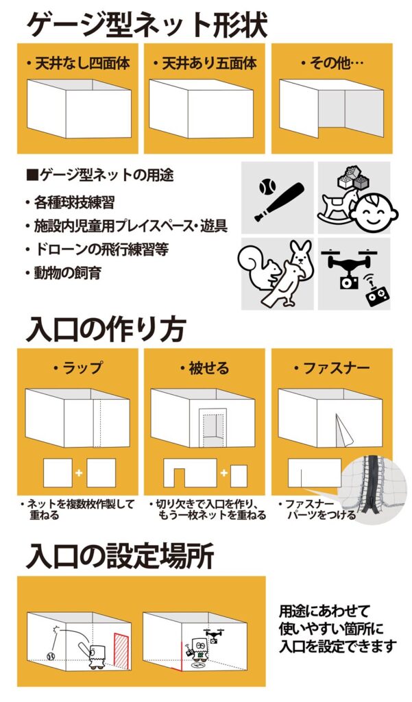 ネットで封鎖した空間に調整や点検で出入りする必要がある場合、ネットファスナーで開閉が可能です。