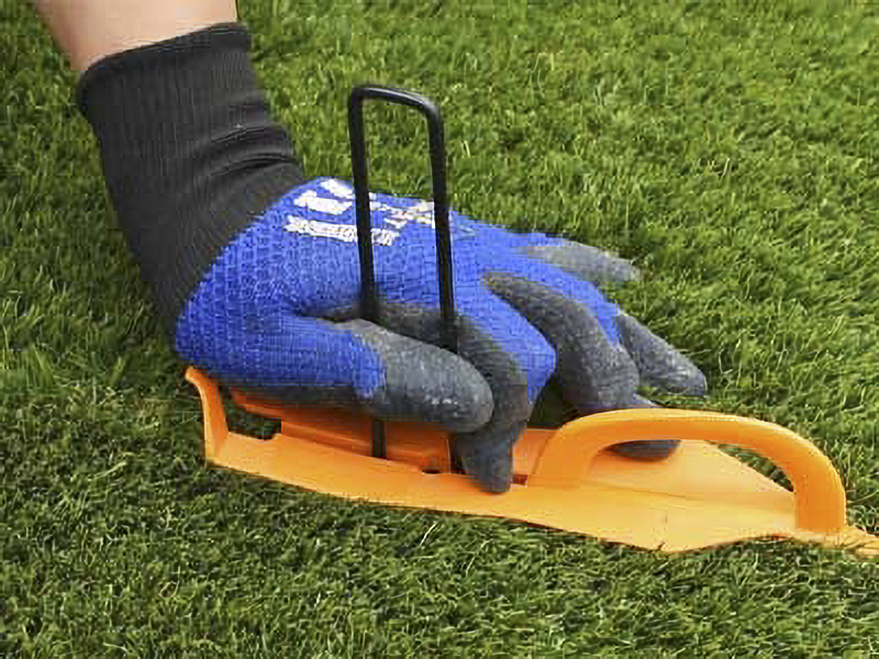 人工芝のパイル掻き分け及び基盤シートへのアンカーピン打ち込み用器具です。