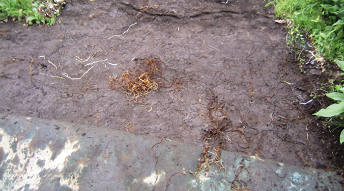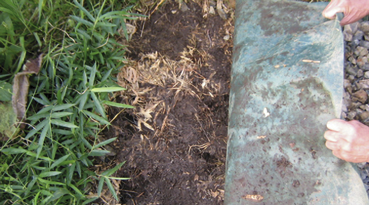 <左:約1年経過例> 240グリーン シート下の雑草は枯れているが土は良い状態 <右:笹の抑制例> 240グリーン 笹によるシートの貫通はなく、下の笹は枯れて抑制されている。