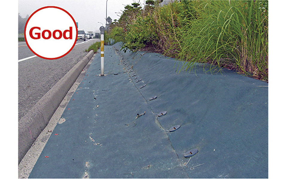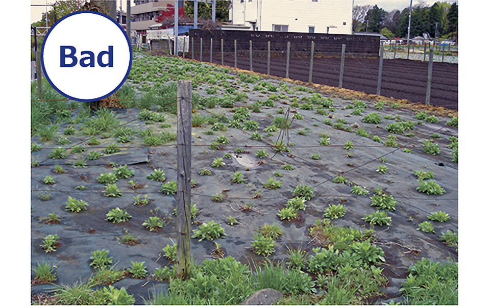 その対策として、GFワッシャー®や防草パッチ®を使用することで、ピン穴部からの雑草を抑制することが可能となります。