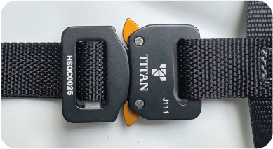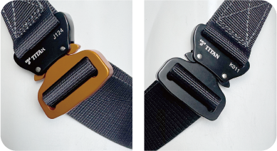 腿バックルはアルミ合金製ワンタッチバックルでつけ間違い防止のため、左右で色が異なります。